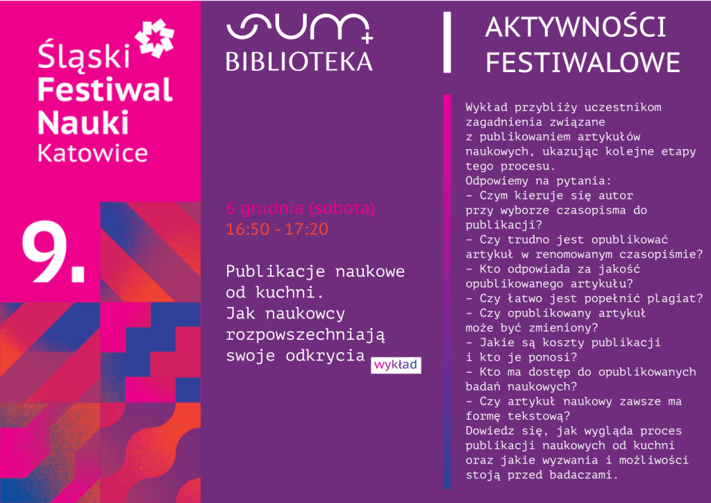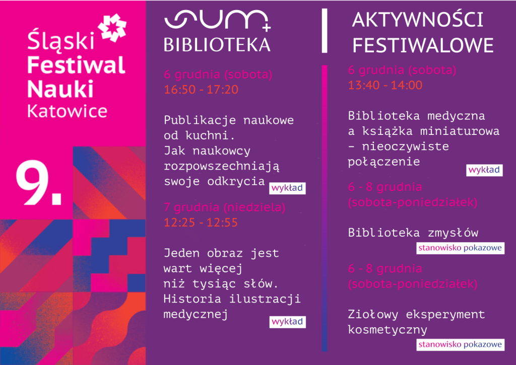 Zespół Biblioteki Śląskiego Uniwersytetu Medycznego serdecznie zaprasza na 9. edycję Śląskiego Festiwalu Nauki, która odbędzie się w dniach 6–8 grudnia (sobota–poniedziałek) w Międzynarodowym Centrum Kongresowym w Katowicach. Bibliotekarze przygotowali dla odwiedzających następujące atrakcje: