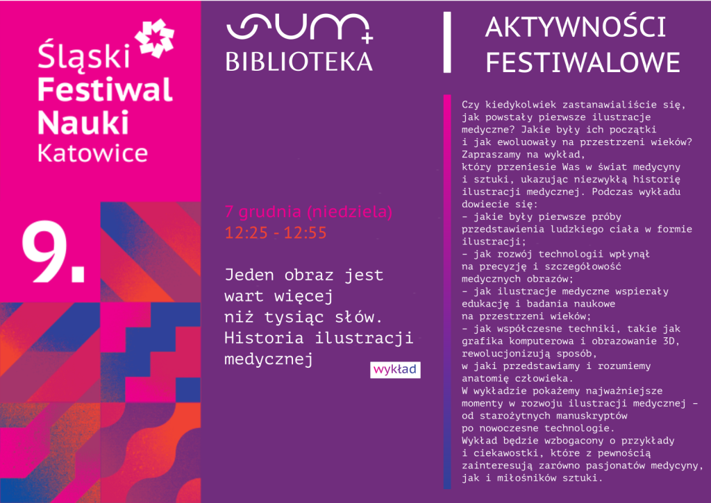 - Jeden obraz jest wart więcej niż tysiąc słów. Historia ilustracji medycznej, prowadząca: mgr Justyna Seiffert, 7 grudnia, 12:25–12:55, lokalizacja: Sala Wielofunkcyjna – Rynek Idei Miasta Nauki: Scena Będziemy Zdrowsi.