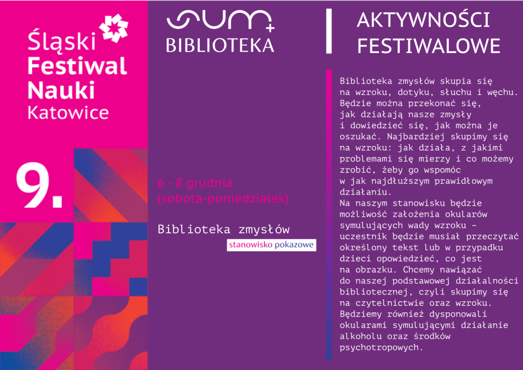 - Biblioteka zmysłów, 6–8 grudnia, lokalizacja: Sala Wielofunkcyjna – Dzielnica Medycyny i Zdrowia.
